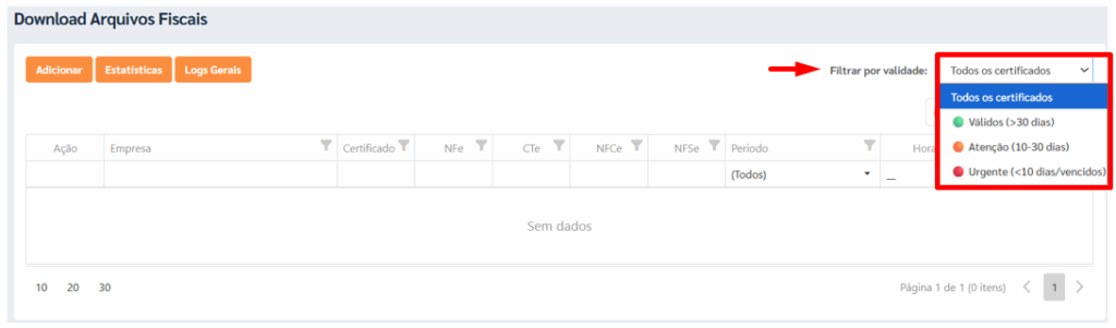 📌 É possível filtrar as empresas de acordo com a validade do certificado, facilitando o gerenciamento preventivo.