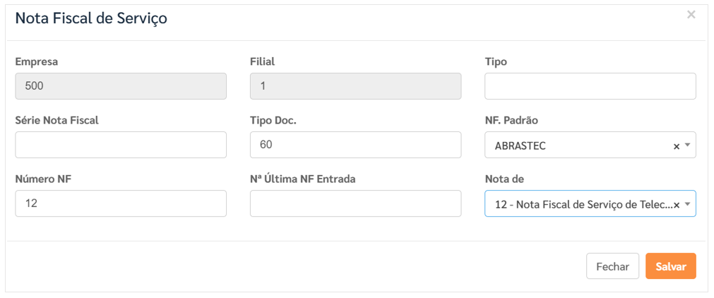 – Para Notas de Telecomunicação, selecione o Tipo de Documento de Telecomunicação.