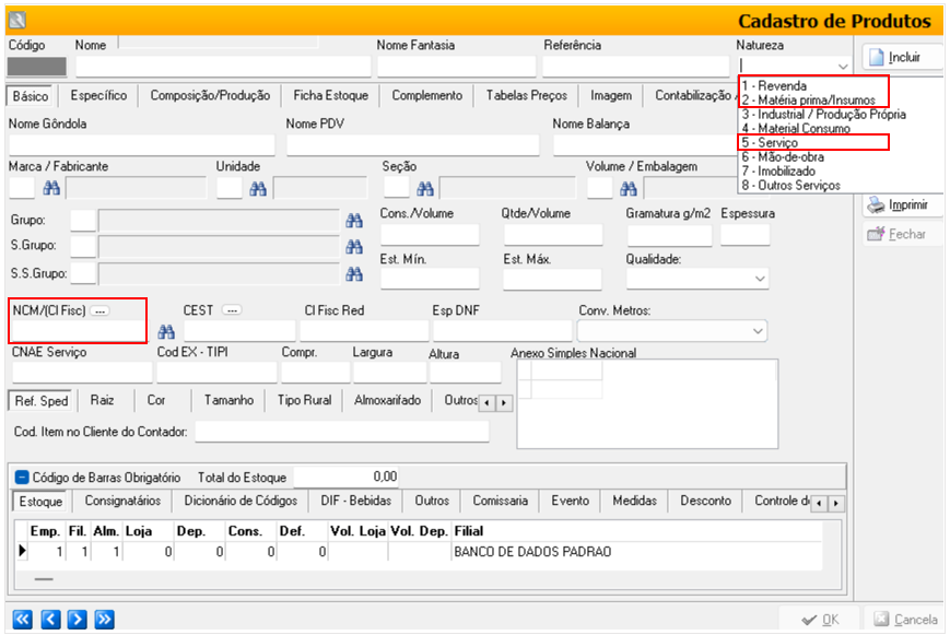 Verifique se o campo Natureza está configurado como 1, 2 ou 5.
