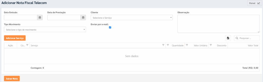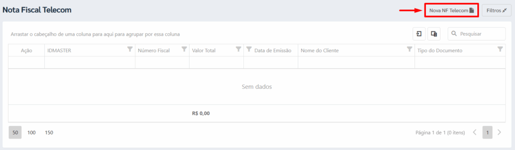 Clique no botão [Nova NF Telecom] para iniciar o cadastro da nota fiscal.