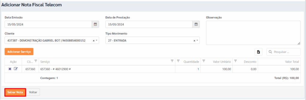 Verifique se o serviço lançado está corretamente exibido na grade da nota fiscal.