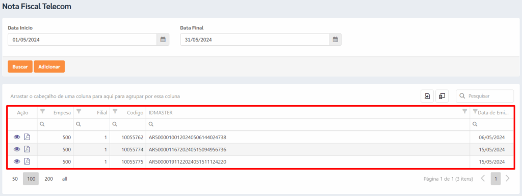 Clique em [Buscar] para carregar a listagem das notas emitidas no intervalo selecionado.