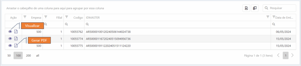 O usuário poderá visualizar a nota fiscal diretamente na tela ou gerar o documento em PDF, clicando nos ícones correspondentes.