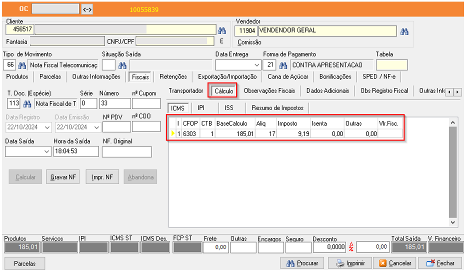 Após a emissão da nota fiscal, é possível validar os cálculos e conferir os detalhes fiscais diretamente no Athenas3000.
