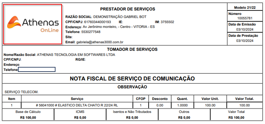 📌 Observação: Caso nenhuma logomarca personalizada seja cadastrada, o sistema utilizará automaticamente a logo padrão do Athenas Online no cabeçalho da nota fiscal.