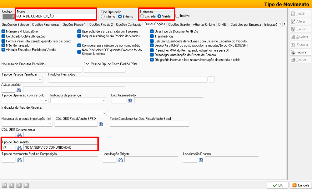 Após cadastrar o Tipo de Documento, é necessário configurar o Tipo de Movimento, que será utilizado para a emissão das Notas Fiscais de Comunicação ou Telecomunicação.