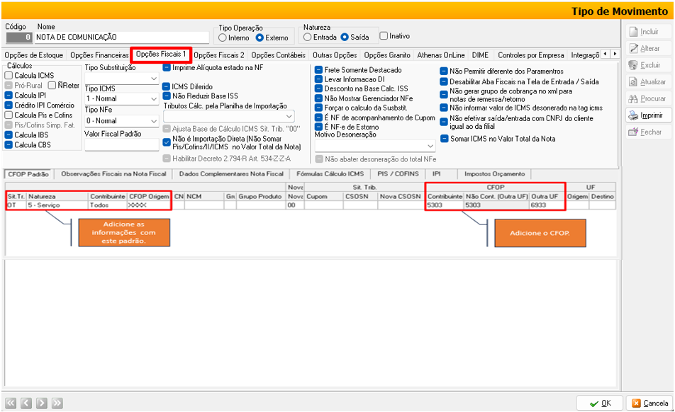 Na aba Opções Fiscais 1 > Subaba CFOP Padrão, configure: