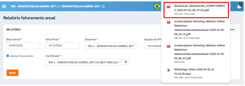 O sistema processará as informações e emitirá a Declaração de Faturamento Anual, com base nas notas fiscais e movimentações do período informado.