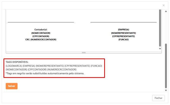 O sistema apresentará um modelo editável com campos pré-definidos (tags).