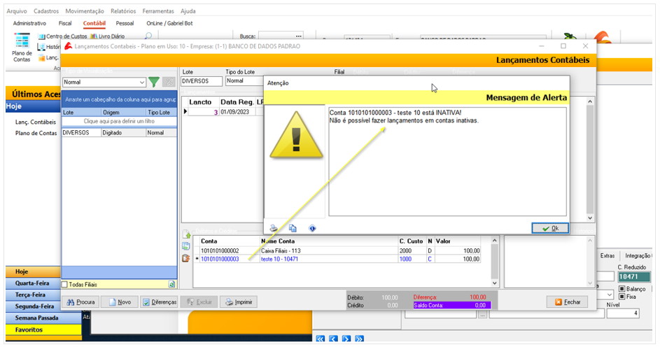 Essa mensagem funciona como um bloqueio e impede a realização de qualquer lançamento vinculado a esta conta.