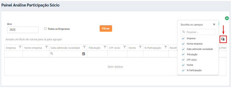 📌 Dica: Utilize essa funcionalidade para ajustar a exibição de dados conforme o foco da sua análise, como participação societária, receita prevista ou regime tributário, otimizando a geração de relatórios personalizados.