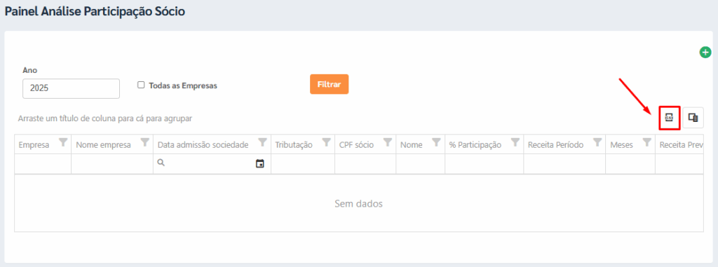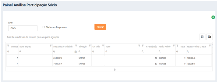 Através desta funcionalidade, é possível analisar e comparar a participação societária dos sócios nas empresas e acompanhar a projeção de receitas anuais de forma consolidada.