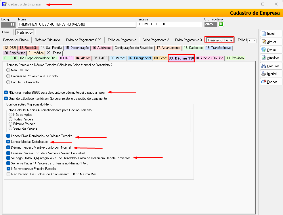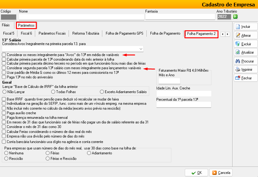 No cadastro da empresa, existem parâmetros que influenciam diretamente a quantidade de avos a serem pagos e o cálculo das médias utilizadas no processamento do 13º salário integral.