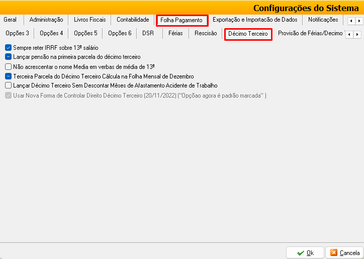 Acesse o menu Arquivo > Configurações > Folha de Pagamento > Décimo Terceiro.