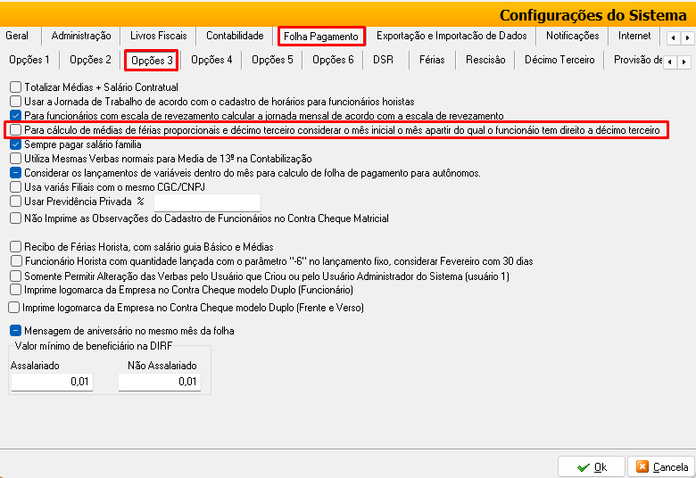 Quando esta opção estiver marcada, o sistema passa a considerar o mês inicial de direito ao 13º salário com base na quantidade de dias trabalhados no mês de admissão.