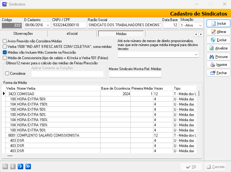 No cadastro do sindicato, existem parâmetros específicos que influenciam diretamente o cálculo das médias utilizadas na composição do 13º salário.