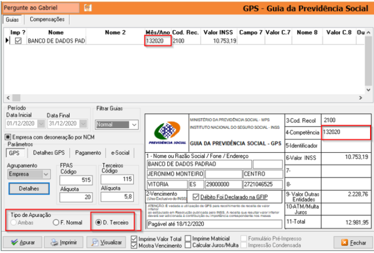 Nesta etapa, será realizada a apuração da Guia da Previdência Social (GPS) referente à folha do 13º salário integral.